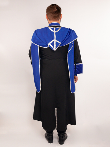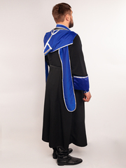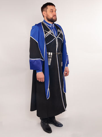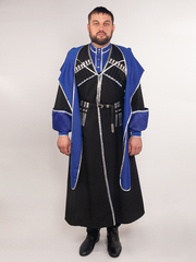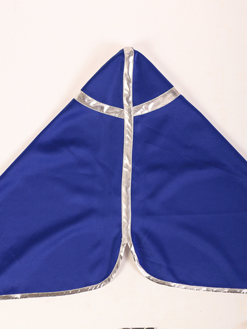 Башлык казачий изготовлен из искусственного шелка (100% полиэстер). Размеры: длина шарфов 137 см., капюшон: высота/грубина 41х32 см. Отделка: атласная лента, серебристого цвета. Есть фиксирующий шнурок. Цвет: синий, красный, черный. В данном варианте и ткани, башлык используется как завершающий элемент костюма.