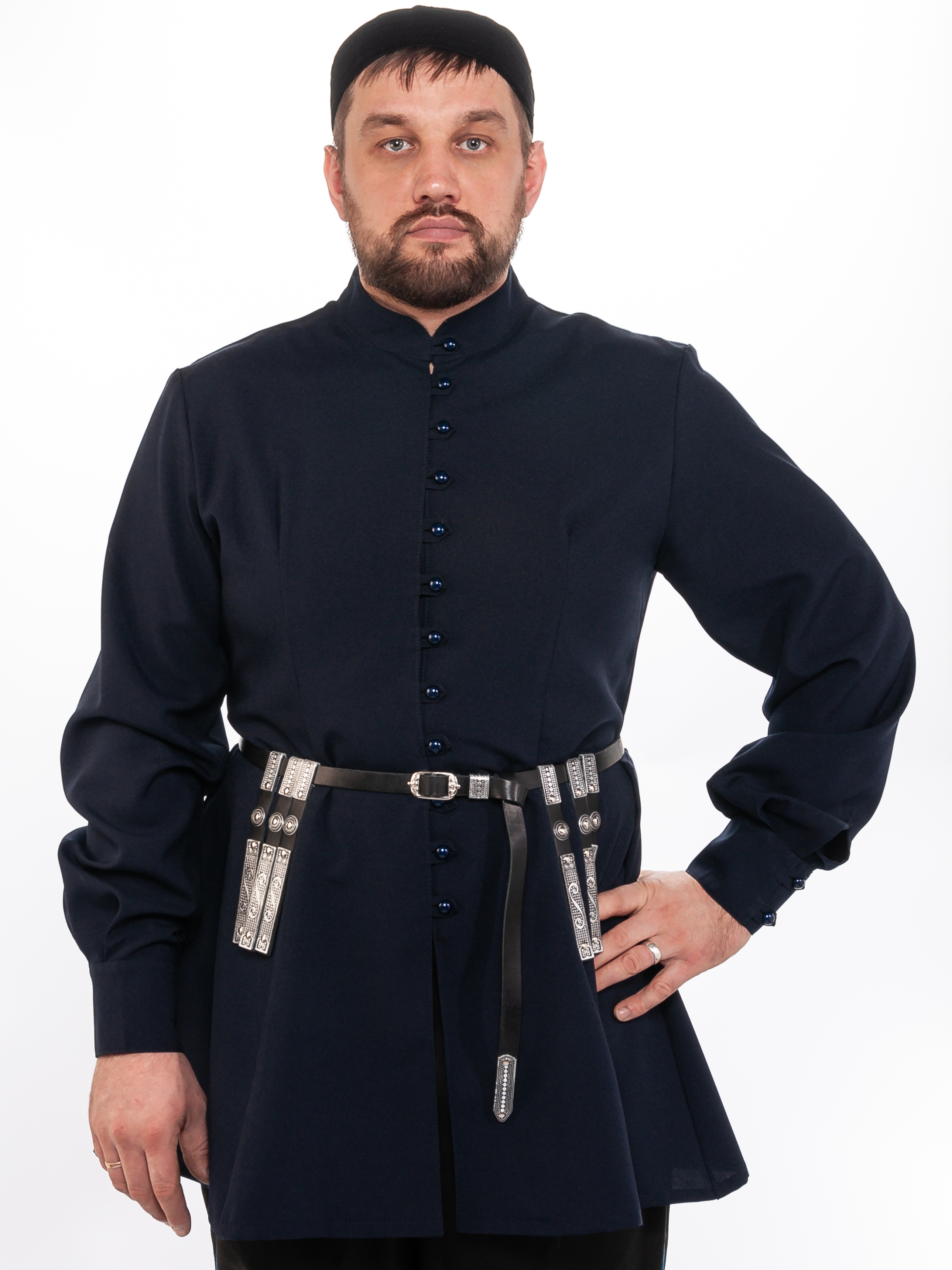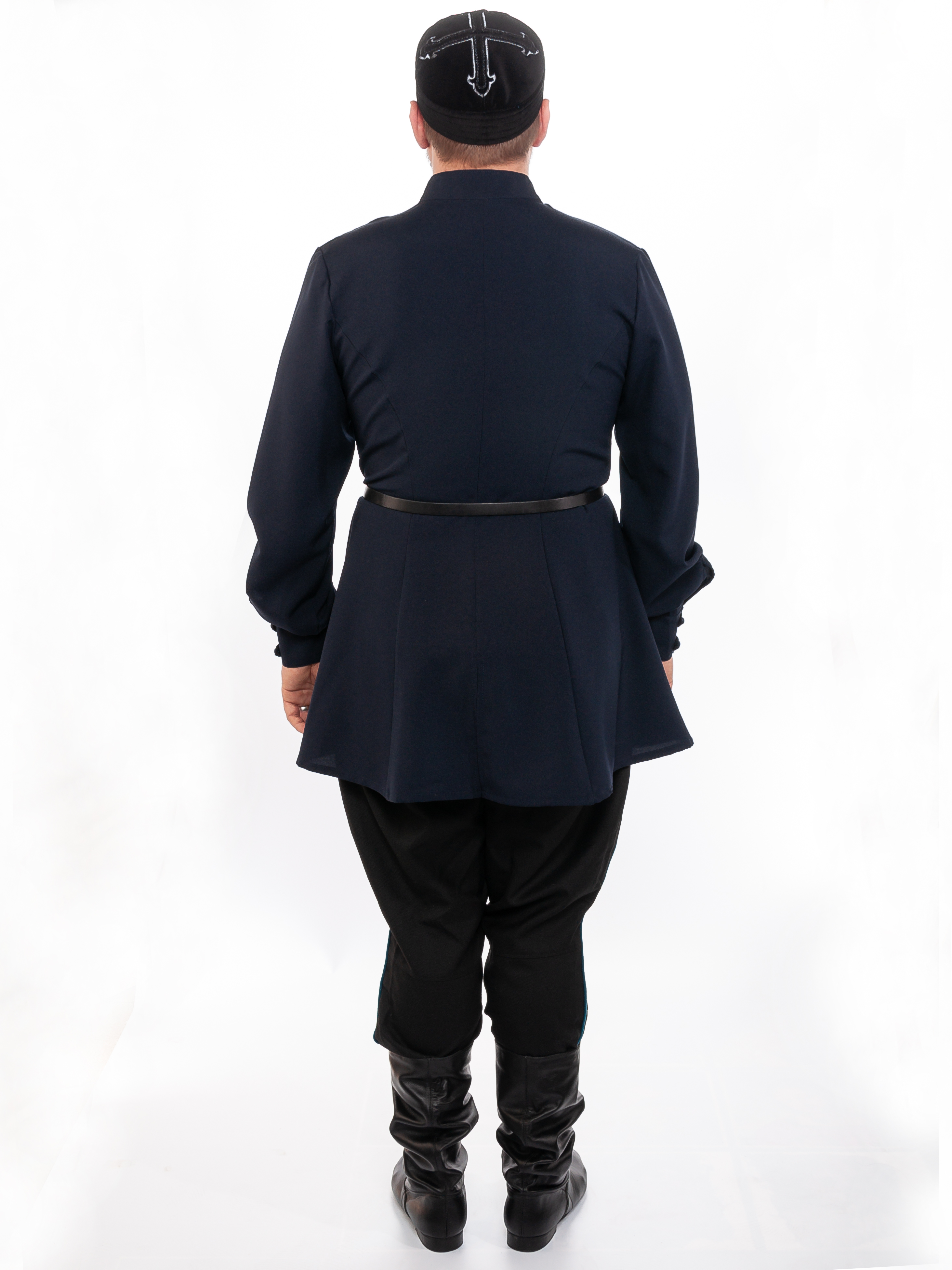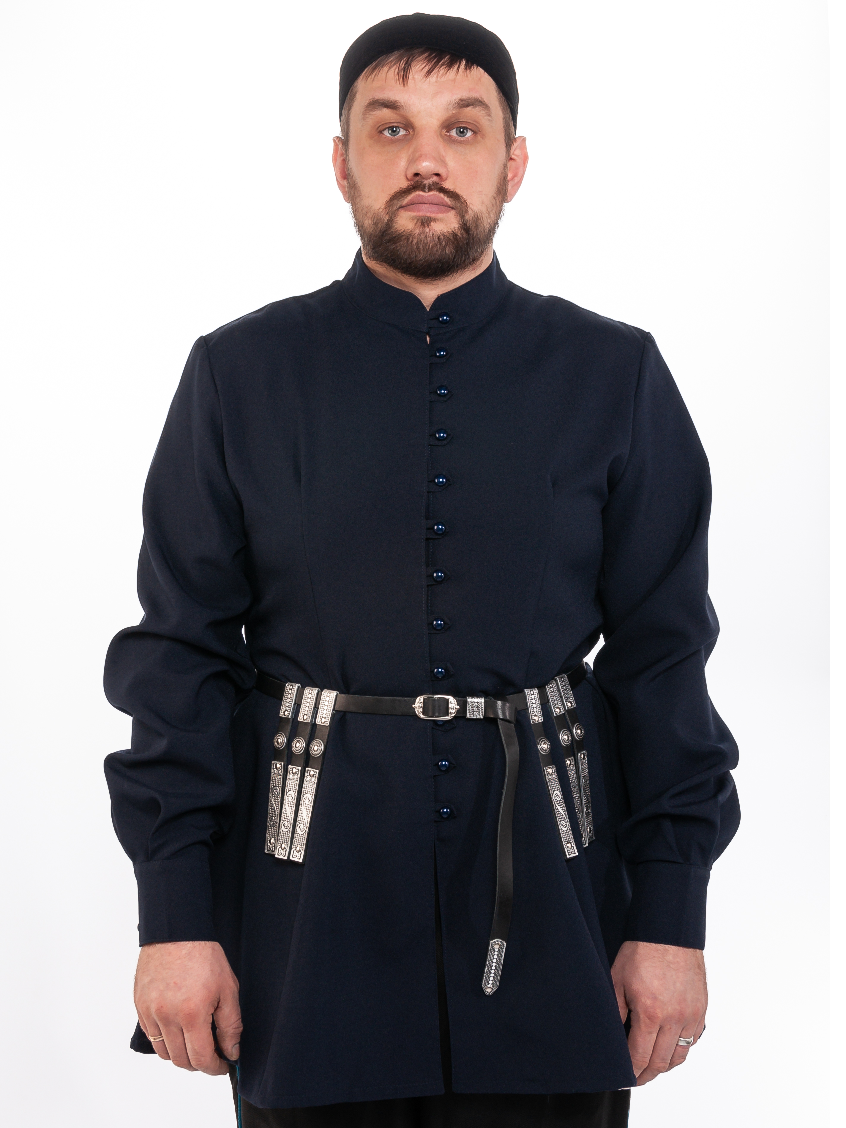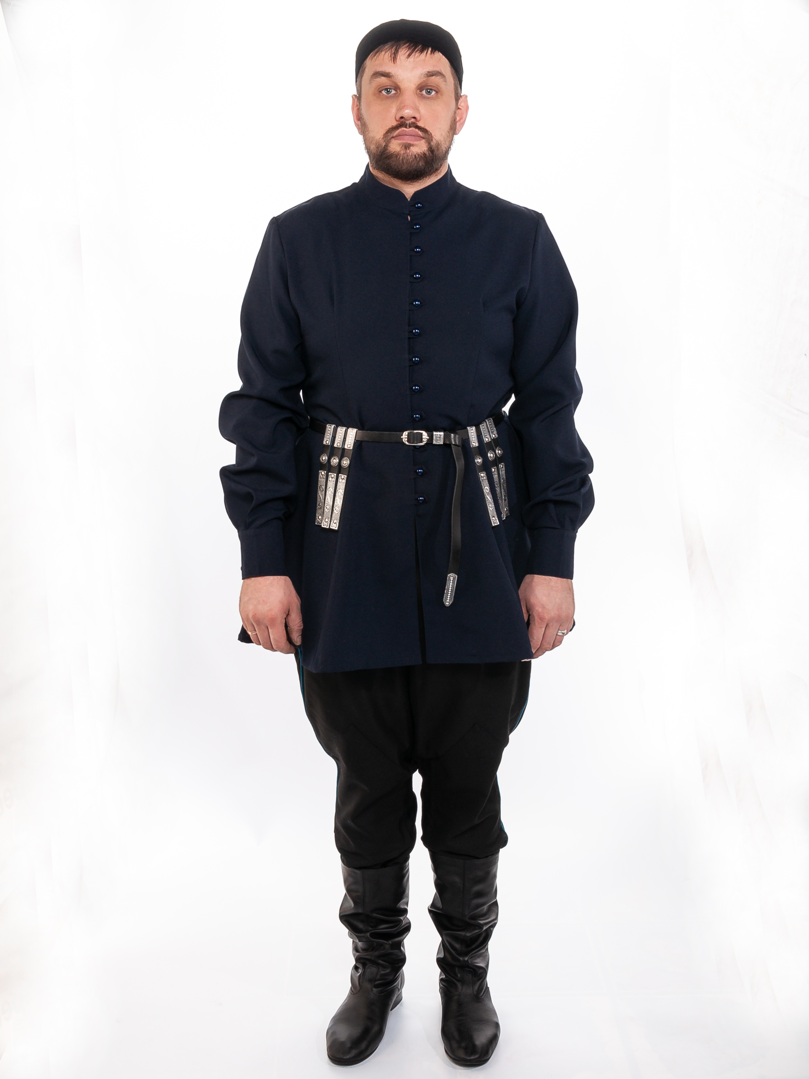 Бешмет традиционный (темно-синий, черный) - изготовлен из габардина (100% полиэстер). Длина бешмета: --- см., рукав длинной 75 см. (ширина манжета 8 см) застегивается на 2 пуговицы., Воротник стойка — 4 см. Застежка: петли +пуговицы. Казачий костюм - это сложившийся на протяжении веков традиционный, форменный, нарядный комплект одежды, используемый как в повседневной жизни так и на праздниках и парадах. Также казачий костюм неотъемлемая часть сценического образа для праздничных концертов, выступлений, казачьих фестивалей, хоровых пений и для других праздничных гуляний. Материал: Форменный габардин (100% полиэстер). Размерный ряд: 48 - 58 , рост: 176 - 182. Пояс в комплект не входит. Уход: ручная стирка до 40 С .