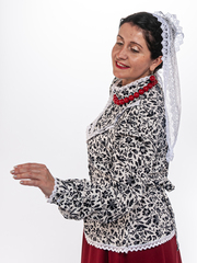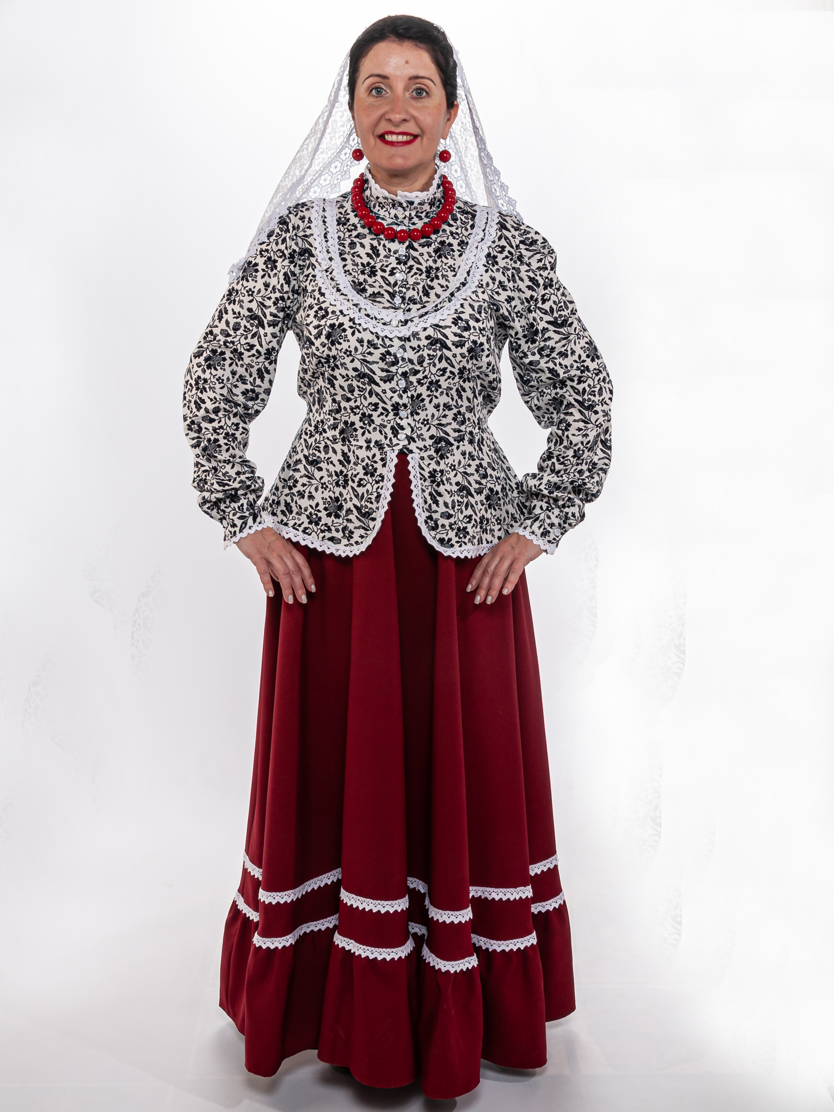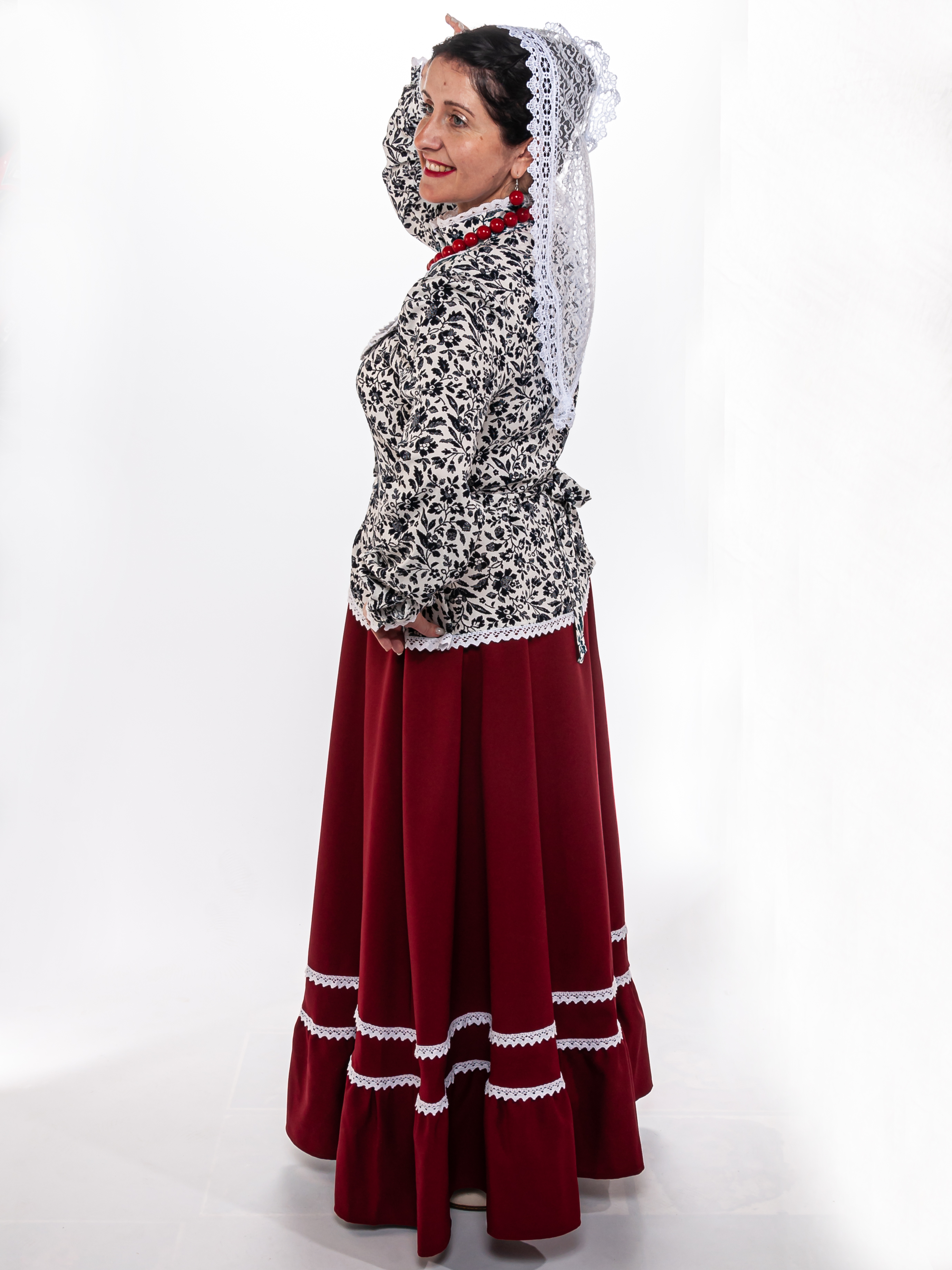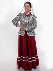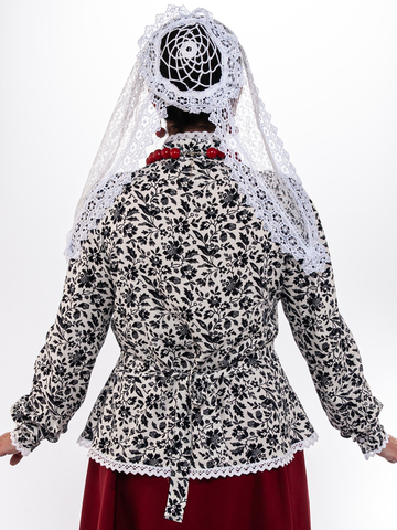 Блузка белого цвета с белым кружевом, традиционного кроя с баской и пояском (вшит в боковые швы). Кокетка на груди украшена воланом, рукава на манжетах, воротник стойка, застегивается кофточка на пуговицы. Материал: 100% хлопок, расшита хлопковым кружевом. Упаковка: пластиковый зип-пакет.ортного ношения. Уход: ручная стирка 40 С .