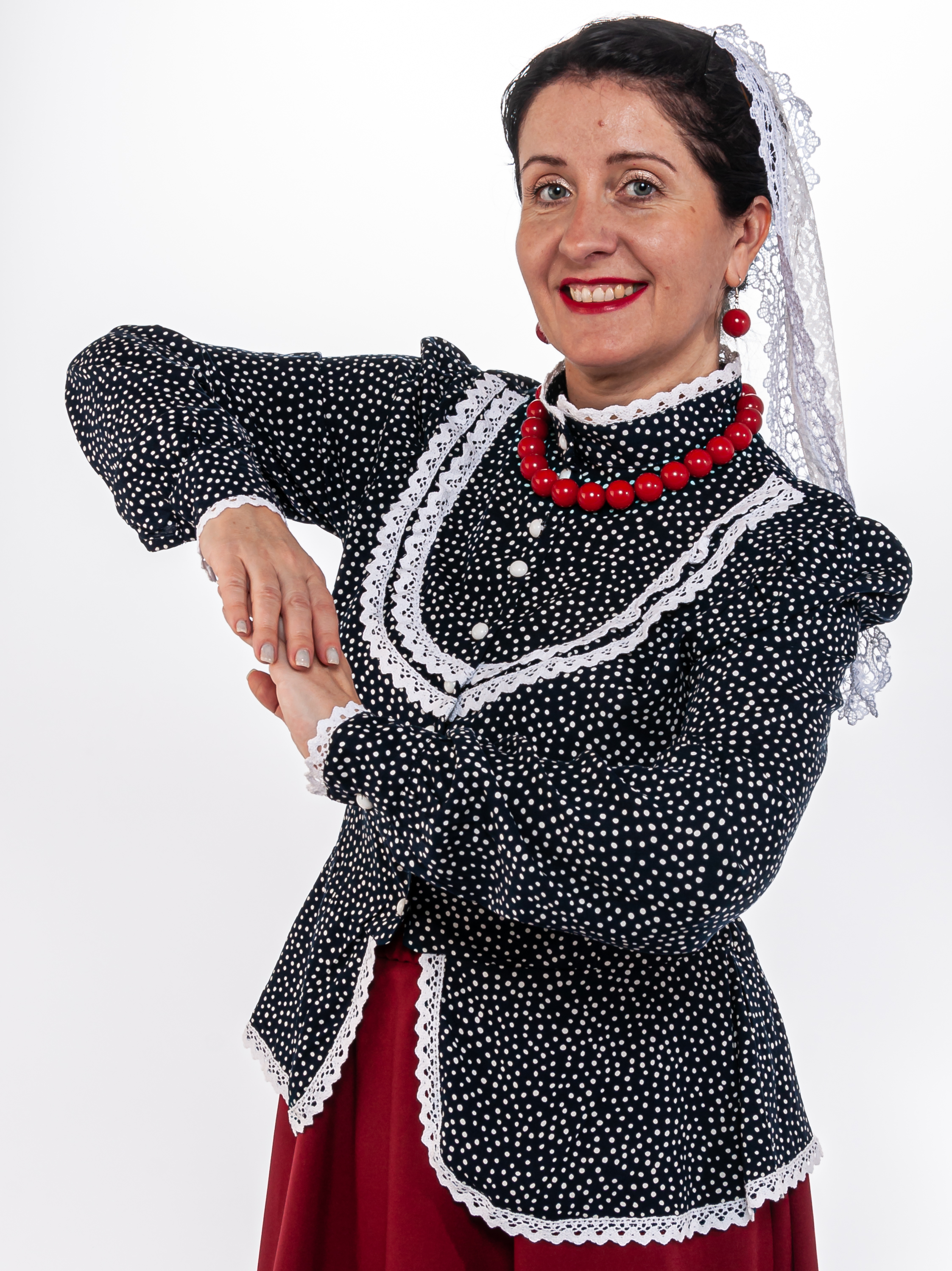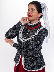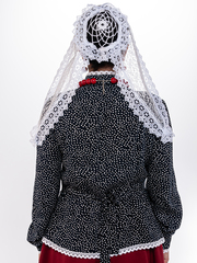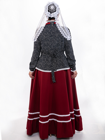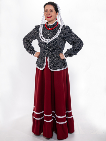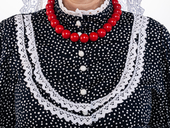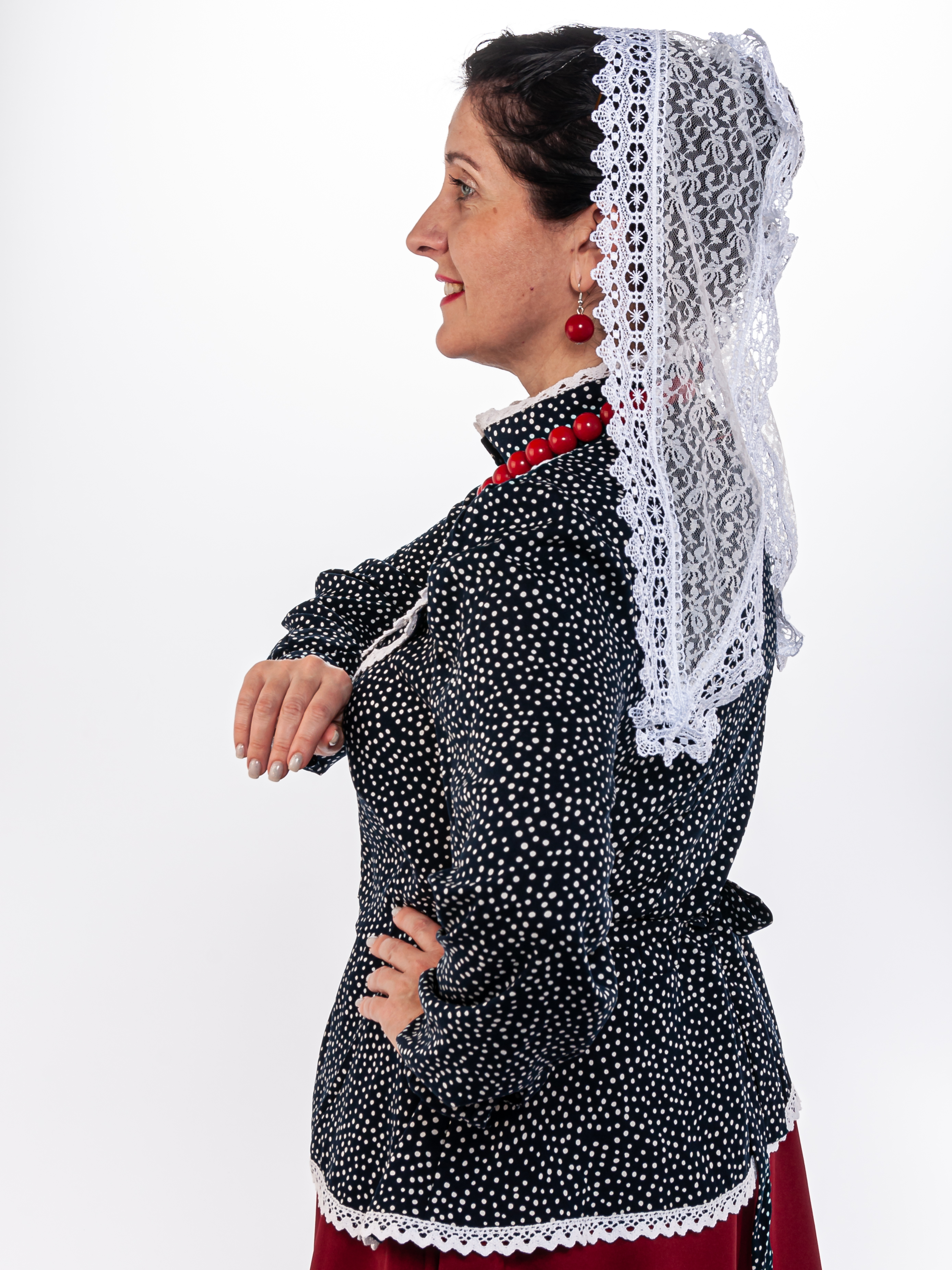 Блузка синего цвета с белым кружевом, традиционного кроя с баской и пояском (вшит в боковые швы). Кокетка на груди украшена воланом, рукава на манжетах, воротник стойка, застегивается кофточка на пуговицы. Материал: 100% хлопок, расшита хлопковым кружевом. Упаковка: пластиковый зип-пакет.ортного ношения. Уход: ручная стирка 40 С .
