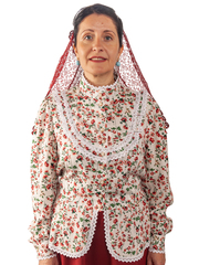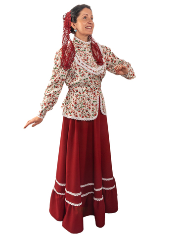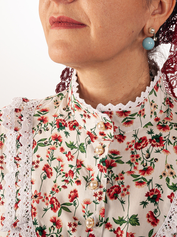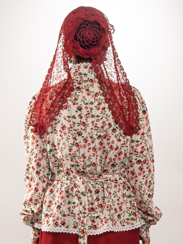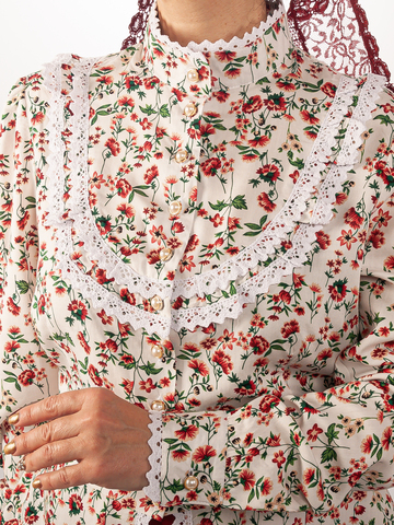 Блузка молочного цвета с белым кружевом, традиционного кроя с баской и пояском (вшит в боковые швы). Кокетка на груди украшена воланом, рукава на манжетах, воротник стойка, застегивается кофточка на пуговицы. Материал: штапель (100% хлопок), расшита хлопковым кружевом. Упаковка: пластиковый зип-пакет.ортного ношения. Уход: ручная стирка 40 С .