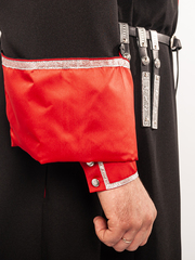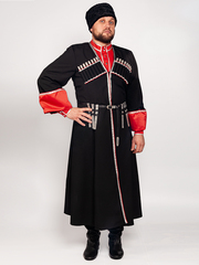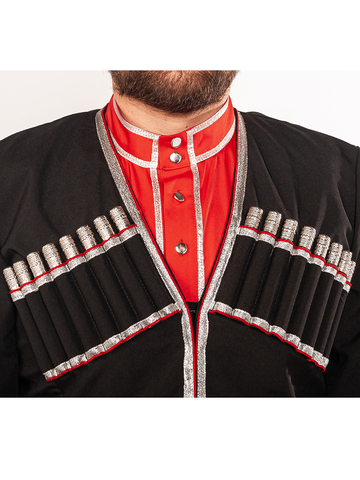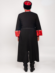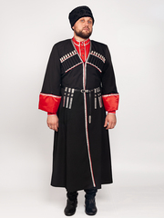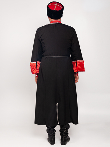Черкеска казачья Кубанская (черная, с красными отворотами), изготовлена из габардина черного цвета (100% полиэстер), отделка красный искусственный атлас (100% полиэстер). Длина (по соответствию роста) в среднем по середину икры, рукав 64-68 см, ширина отворота 15 см. (отворот «держится» на петле и пуговице). Застежка: крючки. Отделка: серебристый галун и сутаж. В боковых швах есть прорези для доступа в карманы брюк, так же разрез по заднему шву для комфортного передвижения. Газырница на груди, рассчитана на комплект из 16-ти газырей. При выборе размера, ориентируйтесь на объем груди (размер = полуобхват груди). Казачий костюм - это сложившийся на протяжении веков традиционный, форменный, нарядный комплект одежды, используемый как в повседневной жизни так и на праздниках и парадах. Также казачий костюм неотъемлемая часть сценического образа для праздничных концертов, выступлений, казачьих фестивалей, хоровых пений и для других праздничных гуляний. Упаковка: пластиковый пакет. Уход : ручная стирка 30С .