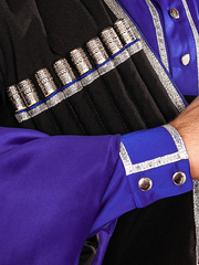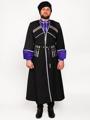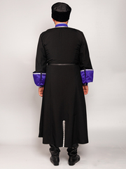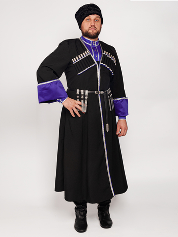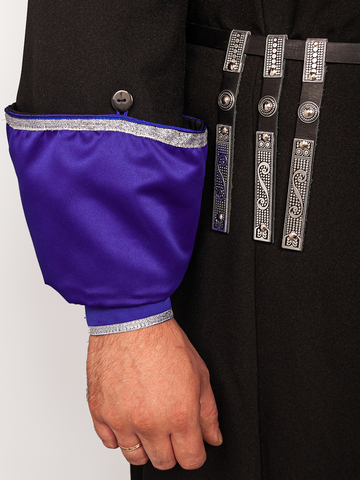 Черкеска казачья Терская (черная, с ксиними отворотами), изготовлена из габардина черного цвета (100% полиэстер), отделка красный искусственный атлас (100% полиэстер). Длина (по соответствию роста) в среднем по середину икры, рукав 64-68 см, ширина отворота 15 см. (отворот «держится» на петле и пуговице). Застежка: крючки. Отделка: серебристый галун и сутаж. В боковых швах есть прорези для доступа в карманы брюк, так же разрез по заднему шву для комфортного передвижения. Газырница на груди, рассчитана на комплект из 16-ти газырей. При выборе размера, ориентируйтесь на объем груди (размер = полуобхват груди). Казачий костюм - это сложившийся на протяжении веков традиционный, форменный, нарядный комплект одежды, используемый как в повседневной жизни так и на праздниках и парадах. Также казачий костюм неотъемлемая часть сценического образа для праздничных концертов, выступлений, казачьих фестивалей, хоровых пений и для других праздничных гуляний. Упаковка: пластиковый пакет. Уход : ручная стирка 30С .