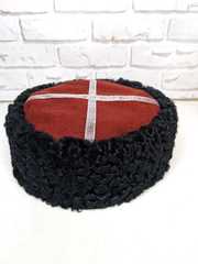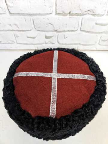 Кубанка из натурального каракуля, чёрная, низкая, с краповым верхом.