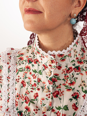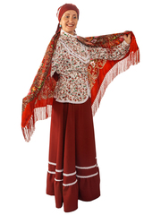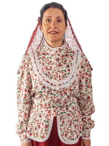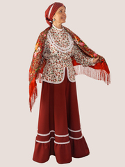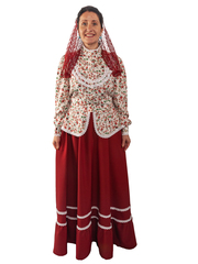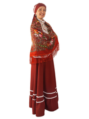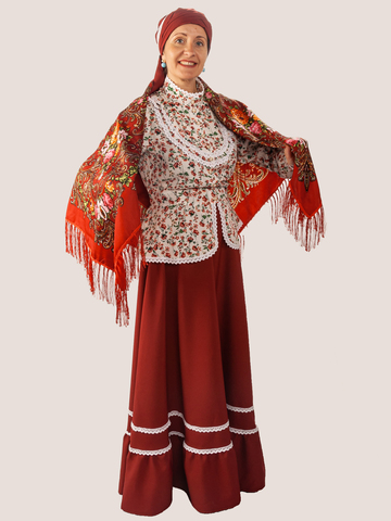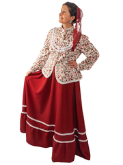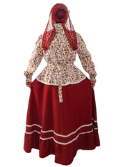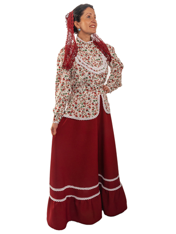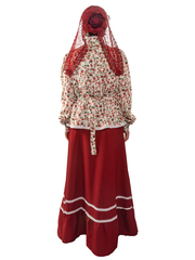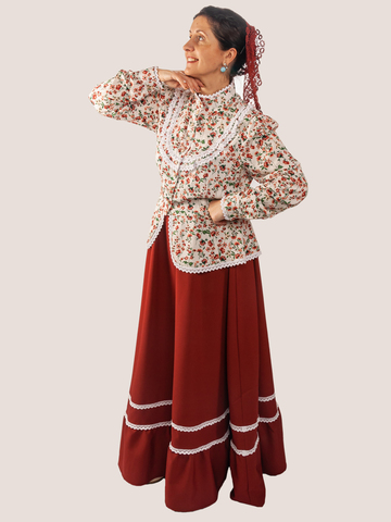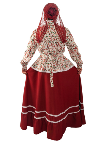 Казачья парочка - традиционный женский костюм. Костюм состоит из кофточки и юбки. Кофточка изготовлена из штапеля (100% хлопок) с рисунком «цветок», фасон традиционный: с кокеткой, рюшами ибаской. Рукава на манжетах, со сборкой по окату плеча. В боковые швы вшиты пояски, для регулировки талии (завязываются сзади). Застежка на пуговички. Лиф кофточки, расшит хлопковым кружевом. Юбка изготовлена из габардина (100% полиэстер), фасон - полусолнце в пол, пояс на резинке, украшена широким воланом и хлопковым кружевом. Казачий костюм от бренда Galuba идеальный выбор, для Казачьих фестивалей, хоровых пений, плясок и других праздничных гуляний в русском стиле.