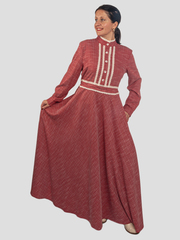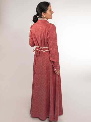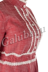 Красивое и невероятно женственное платье . Стойка воротник и перед платья украшен кружевом , что придаёт платью элегантный вид . Рукава на манжетах , талия регулируется на кулиске . Удобная застёжка на пуговицы позволяет не только с комфортом надеть платье ,но и покормить ребенка грудью . В боковых карманах для Вашего удобства есть карманы .Материал:50%- хлопок, 50% - лавсановая нить. Кружево: полиэстер. Длина юбки: 100 см.
